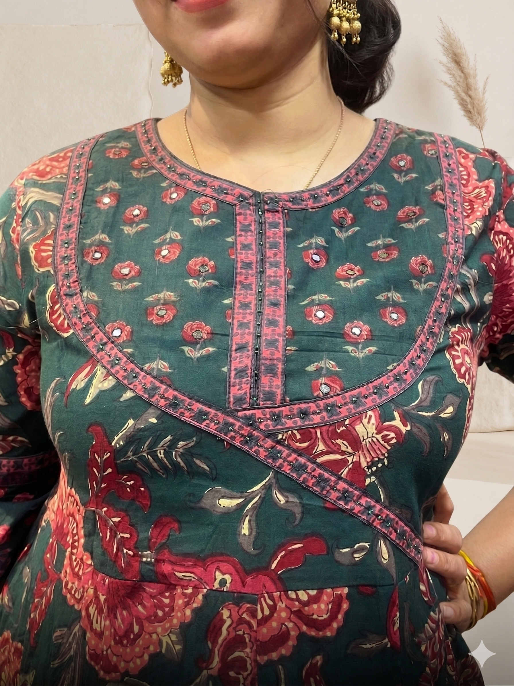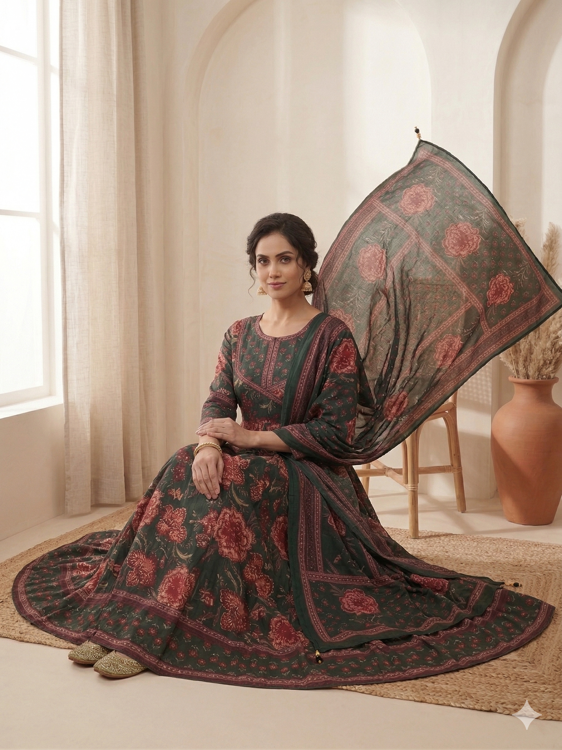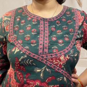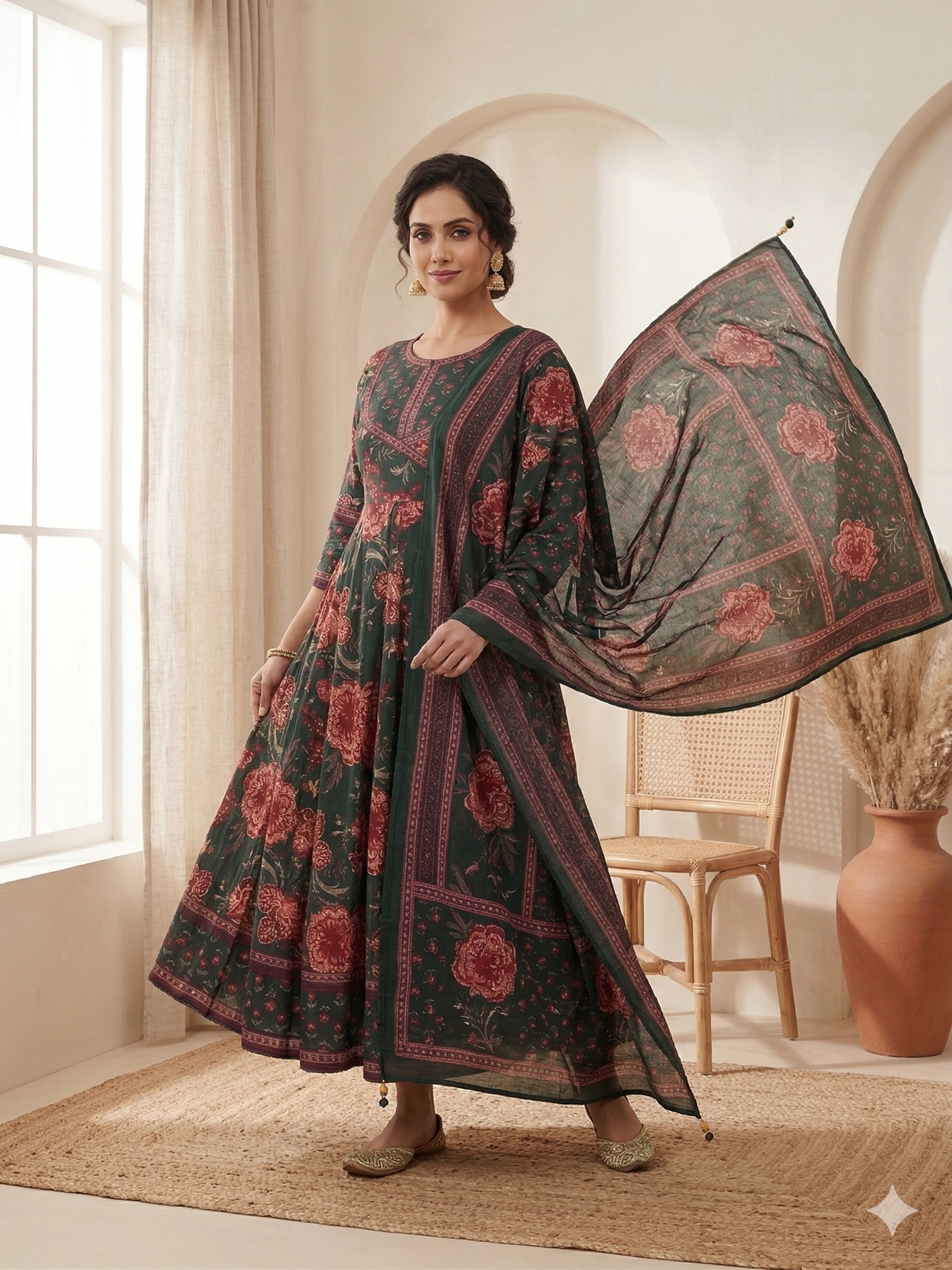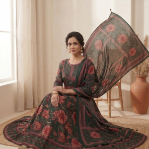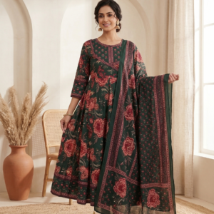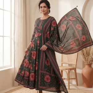 Step into timeless elegance with this beautifully crafted green floral Anarkali suit set made from premium pure cotton. Featuring intricate floral prints with rich ethnic patterns, this outfit exudes a regal yet earthy charm. The flowy Anarkali silhouette adds graceful movement, while the breathable cotton fabric ensures all-day comfort. Paired with a matching printed dupatta, this ensemble is perfect for festive gatherings, cultural events, and elegant day wear.