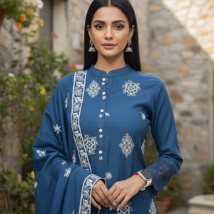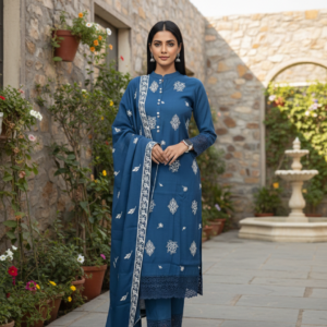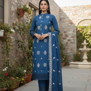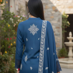 Make a graceful statement with this elegant teal straight suit set crafted in premium Mira silk, paired with a lightweight organza dupatta. Featuring delicate white embroidery across the kurta and fine lace detailing on the sleeves and hem, this set blends festive charm with a modern silhouette. The smooth Mira silk fabric drapes beautifully and feels comfortable for long wear, making it perfect for festive occasions, parties, and special family functions. A complete, classy outfit for refined ethnic style.